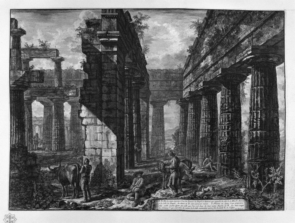 此时此刻,我们在18世纪的皮拉内西做着一样的事。皮拉内西面对着城市中大片古典的废墟,选择了通过版画将来自罗马的宏伟壮丽保存下来,汇编成的画册《罗马古迹》中,对于废墟的描绘竟有数百张之多。皮拉内西通过这种描绘传递了古罗马建筑独特的崇高感——即便是颓坍的、没有外在装饰的,依然从柱式排列中散发出无上的崇高永恒、令人怖惧、崇敬、赞叹。